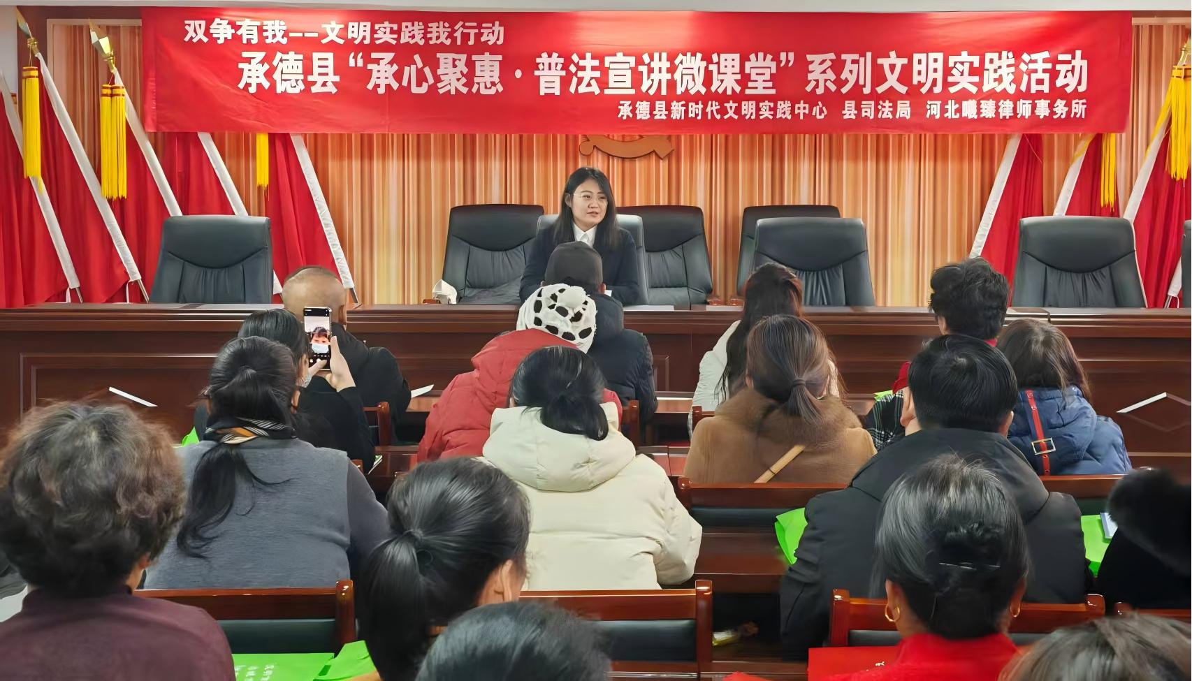 宪法宣传日当天,承德县新时代文明实践中心的红色条幅字字铿锵——“双争有我——文明实践我行动 承德县‘承心聚惠·普法宣讲微课堂’系列文明实践活动”,河北曦臻律师事务所的普法身影,正是以实际行动践行“双争”倡议、厚植法治文明的生动实践:把宪法精神落进群众生活,以专业服务扛起基层法治建设的政治责任。