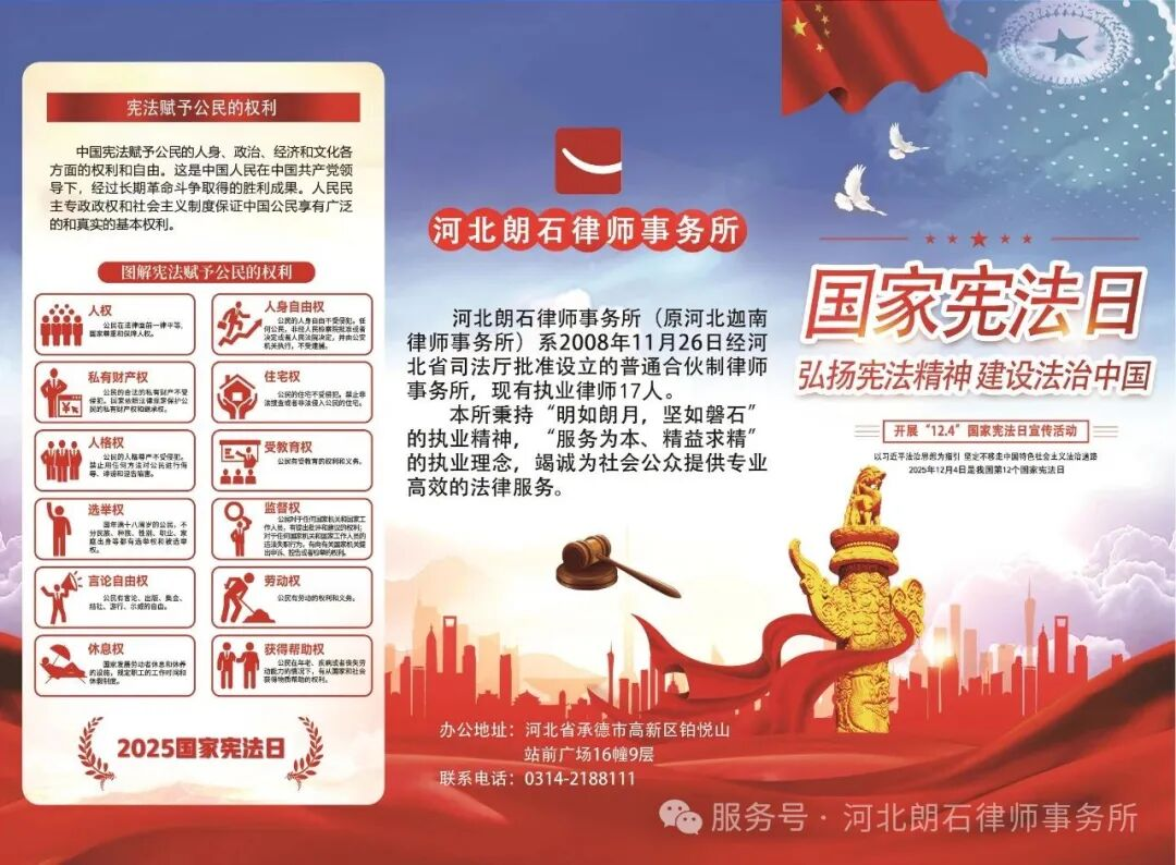 2025年12月4日,在第12个国家宪法日,为深入学习宣传宪法知识,弘扬宪法精神,维护宪法权威,增强全民法治观念,河北朗石律师事务所积极响应号召,组织精干律师团队,在承德南站广场成功举办了以“学习宣传贯彻习近平法治思想,推动宪法深入人心”为主题“12·4”国家宪法日普法宣传公益活动。