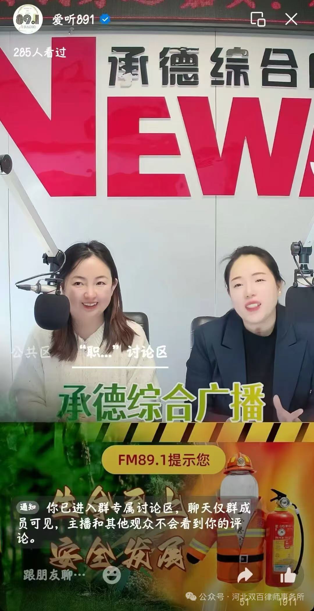 在第八个宪法宣传周、第十二个国家宪法日来临之际,为推动宪法深入人心,切实做好宪法普法宣传工作,应承德广播电视台邀请,我所副主任、工会主席康淑敏律师作为承德市职工法律服务团成员,做客承德市总工会 “工会新时空” 2025 年宪法宣传周特别节目,以《宪法,就在你我身边》为题开展 50 分钟普法访谈,从民生视角拆解宪法中的权利保障要点,为广大听众送上实用的法律知识。