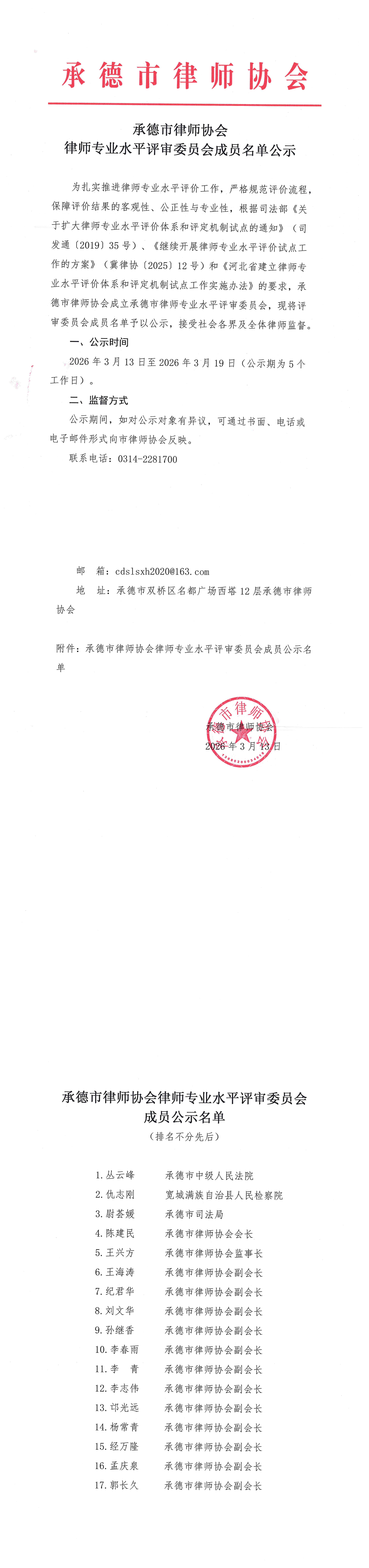 承德市律师协会律师专业水平评审委员会成员名单公示