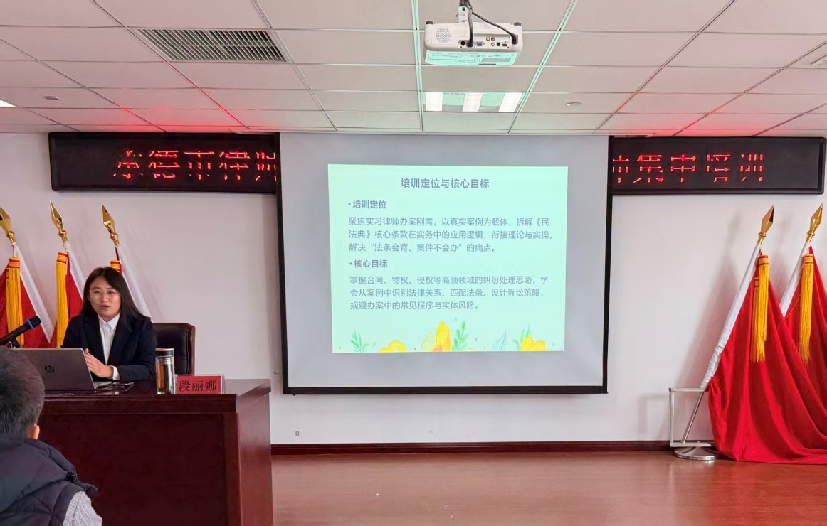 上午10时30分,市律协教育培训委员会副主任段丽娜接棒授课,以“以案释法——《民法典》办案事务分享”为主题,聚焦民事法律实务重点难点。她摒弃枯燥的法条堆砌,精选民事领域内多起具有典型性、代表性的案例,从案件事实梳理、法律关系分析到裁判思路解读,层层深入剖析实务中的核心问题与应对难点。授课中,她通过还原不同场景下的案件处理逻辑,清晰拆解“如何匹配法律条款与案件事实”“如何预判裁判倾向”等关键要点,帮助实习律师快速掌握《民法典》在实际办案中的应用方法,为今后处理各类民事法律事务提供清晰指引。